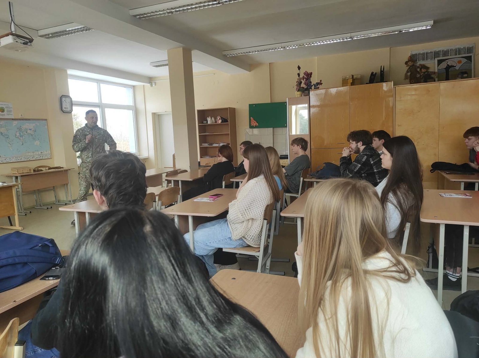 Kovo 12 dieną Lietuvos kariuomenės karo prievolės ir komplektavimo tarnybos Klaipėdos regioninio karo prievolės ir komplektavimo skyriaus vyresnysis verbuotojas štabo seržantas Andrius Pekūnas III klasės mokiniams pristatė tarnybos būdus Lietuvos