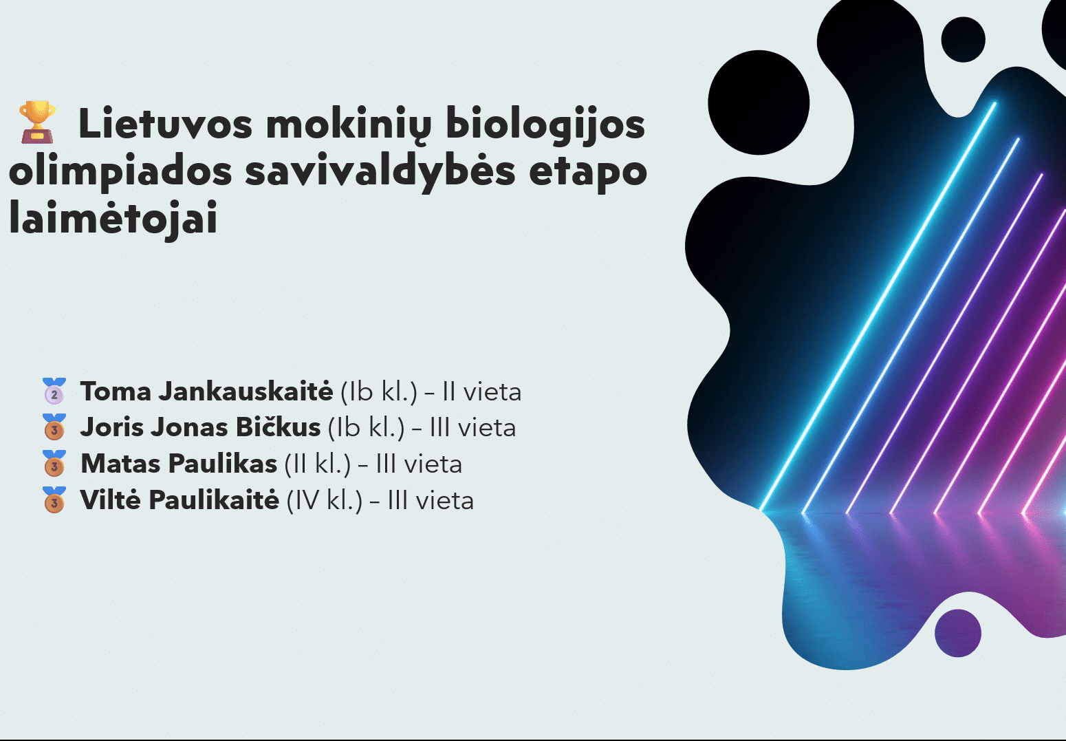 Sveikiname mūsų gimnazijos mokinius, Lietuvos mokinių biologijos olimpiados savivaldybės etapo laimėjus: Tomą Jankauskaitę, Ib klasė, II vieta, Jorį Joną Bičkų, Ib klasė, III vieta, Matą Pauliką, II klasė, III vieta,